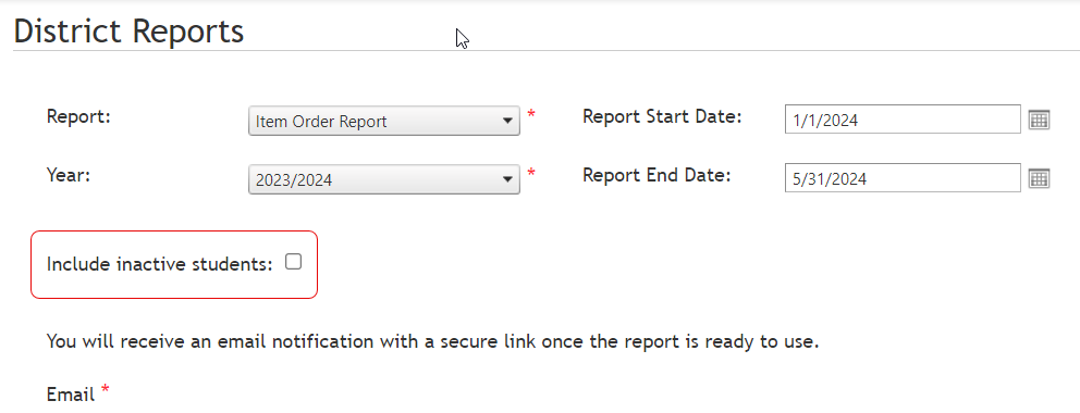 NOTE: At time of this article being written (June 2024), this will generate for all items in the district. - Select the Year and Report Start/End Dates