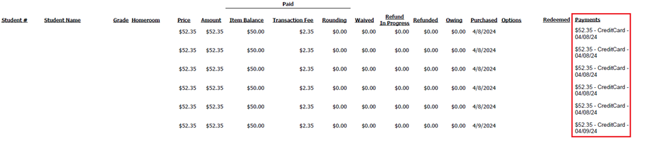 Payment methods can also be viewed in the following SchoolCash Catalog reports: